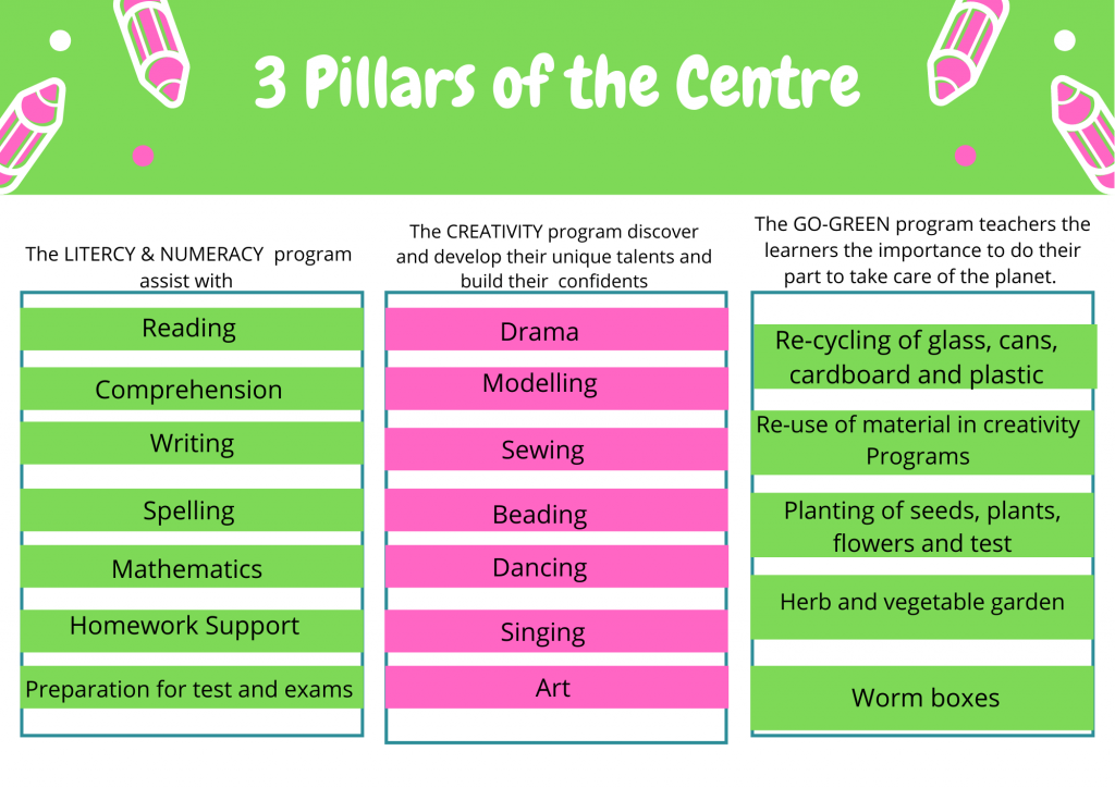 The Learning Support Centre has classes in Literacy (Afrikaans and English), Numeracy , Creativity and Go-Green Activities.